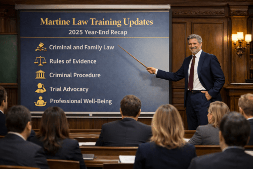 Martine Law Training Updates will continue to focus on key areas of litigation, including Criminal and Family Law, Evidence and Procedure, and Trial Advocacy. With a subscriber base approaching 4,000 attorneys, judges, and legal professionals, these updates reflect our firm’s belief that legal education is the soul of the judiciary.